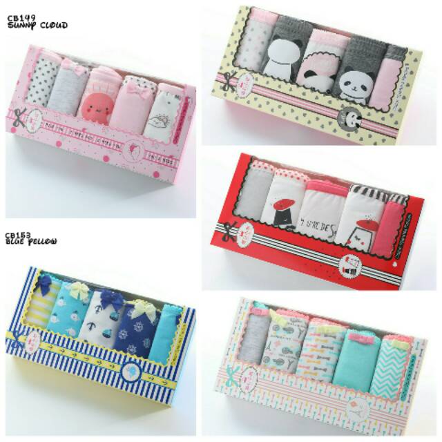 set celana dalam dengan kemasan kotak, 1 set terdiri dari 5 pcs celana dalam dengan motif berbeda.