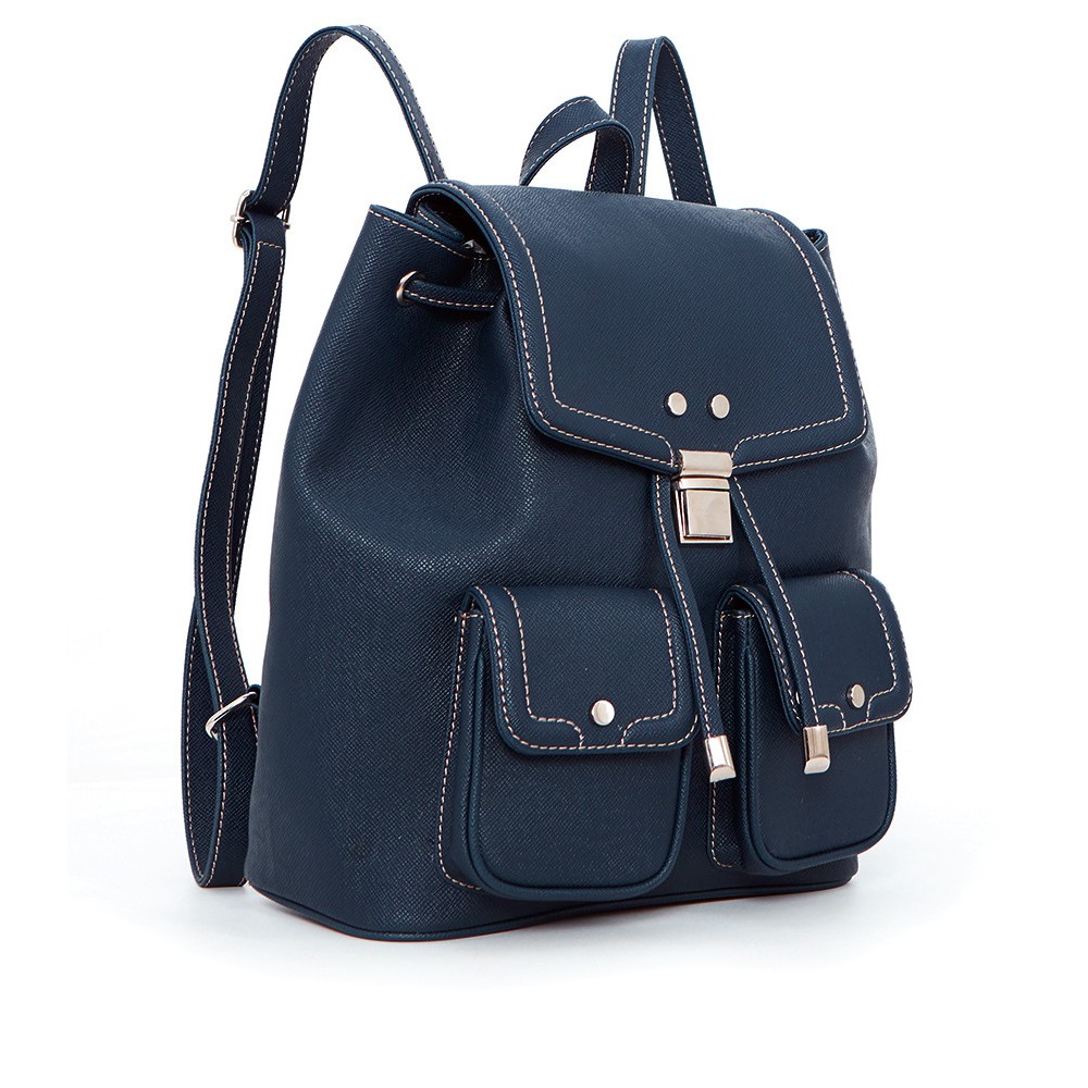 tas punggung berbahan kulit sintetis dengan warna navy; terdiri dari 1 kantong utama dengan tali serut; 1 kantong resleting didalam dan 2 kantong dengan flap didepan.; backpack; rucksack; pvc; navy; 27 x 12;5 x 30 cm;