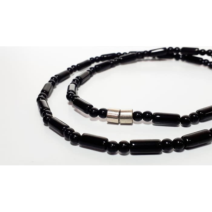 kalung ini dirangkai menggunakan tali nilon dengan mata penghubung magnet dikedua ujung talinya sedangkan gelang dirangkai menggunakan tali senar elastis yang bisa meyesuaikan dengan besarnya pergelangan tangan.