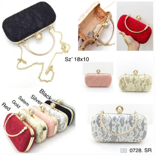tas pesta dengan bahan brukat dan gliter terdapat hiasan mutiara pada penutupnya dan juga tentengan yang elegant ikut melengkapi kemewahan tas ini
