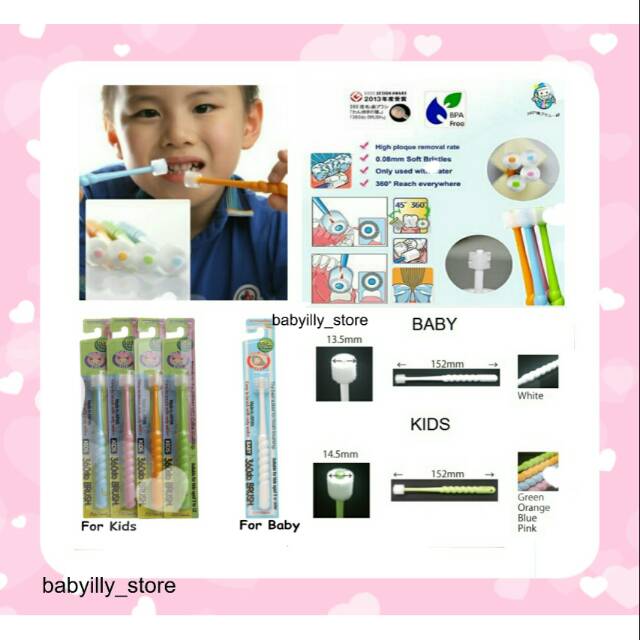 360do brush kids bisa digunakan untuk anak-anak usia 3 sd 12 tahun. sikat gigi kids memiliki beberapa pilihan warna.