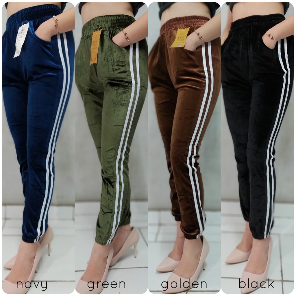 📌 celana panjang wanita terbaru, bawahnya model jogger, bahannya bludru yang kekinian, dipercantik dengan aksen stripes di samping 😍😍