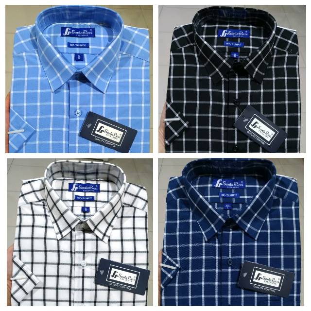 Kemeja Kasual Atasan Pria Slimfit Santa Ricci by MF LENGAN PENDEK Kotak Retro Semi Flanel Putih Biru Navy Hitam Murah