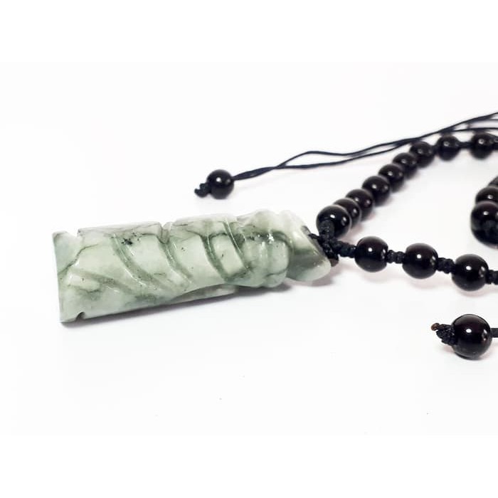 liontin yang terbuat dari batu natural atau batu alam berjenis giok ini terbilang unik karena modelnya menyerupai tiang / tabung yang diukir.