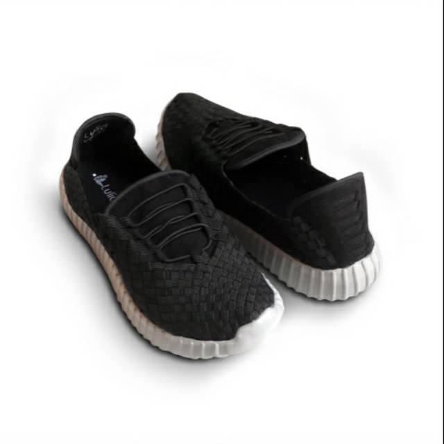 sepatu anyaman pria dengan bahan dasar pita nylon dikombinasikan dengan karet nylon yang dirajut 100% handmade, dengan outsole yang ringan.