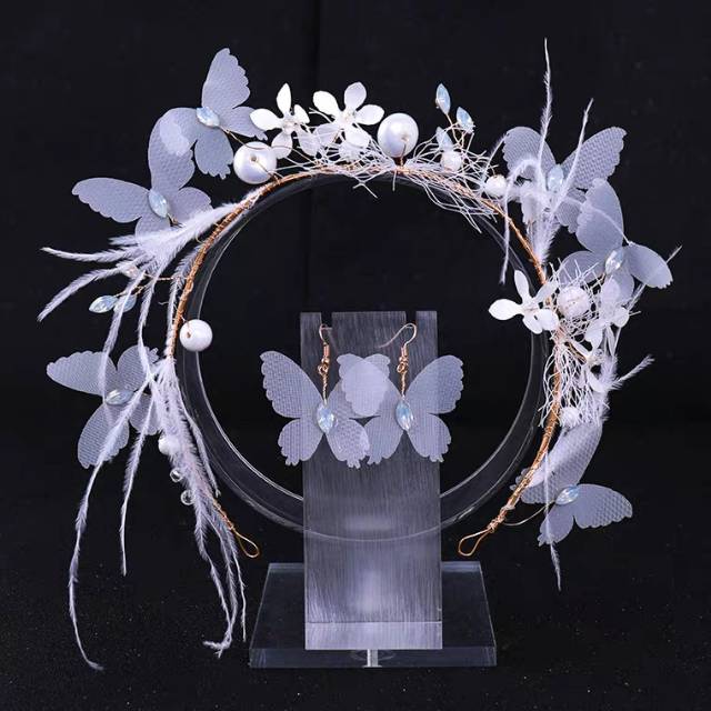 hiasan rambut kawat lentur warna gold variasi monte monte dan hiasan bahan kain putih. panjang 33cm. harga per set dengan sepasang anting ukuran panjang 5x5cm.