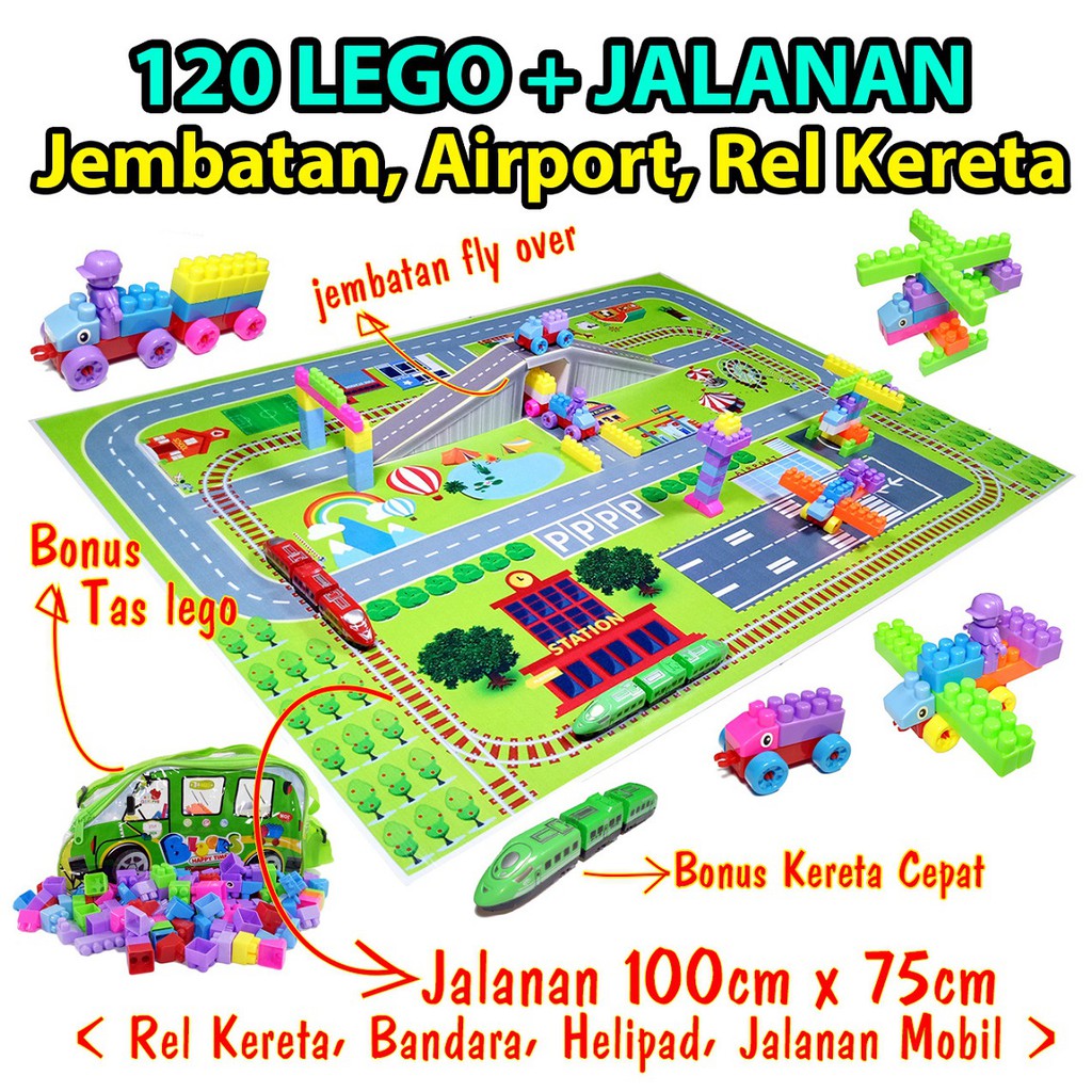 mainan arena jalanan lego yang di gelar di lantai untuk main mobil-mobilan anak-anak, buat main lego yang ada mobilnya, bisa juga untuk main mobil lain.