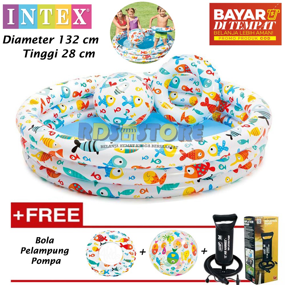 kolam renang untuk mandi anak terbentuk dari tiga ring warna-warni yang masing-masing dipompa karena memiliki ventil pada tiap ringnya. intex ocean pool merupakan kolam renang portable dimana kolam renang ini mudah untuk di pindah-pindahkan dan mudah untuk dibawa serta tidak memakan ruang tempat terlalu besar. dengan kolam renang ini, orang tua dapat mengawasi buah hatinya setiap saat.