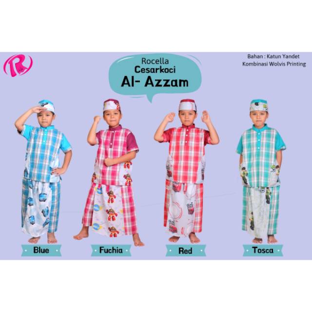 cesarkoci al-azzam adalah produk kombinasi setelan celana sarung, koko dan peci, yang dibuat dari bahan yang sangat nyaman sehingga cocok untuk aktivitas buah hati kita. cesarkoci ini didesign dengan karakter2 kartun favorit,, pastinya bisa bikin buah hati tambah semangat memakainya π
