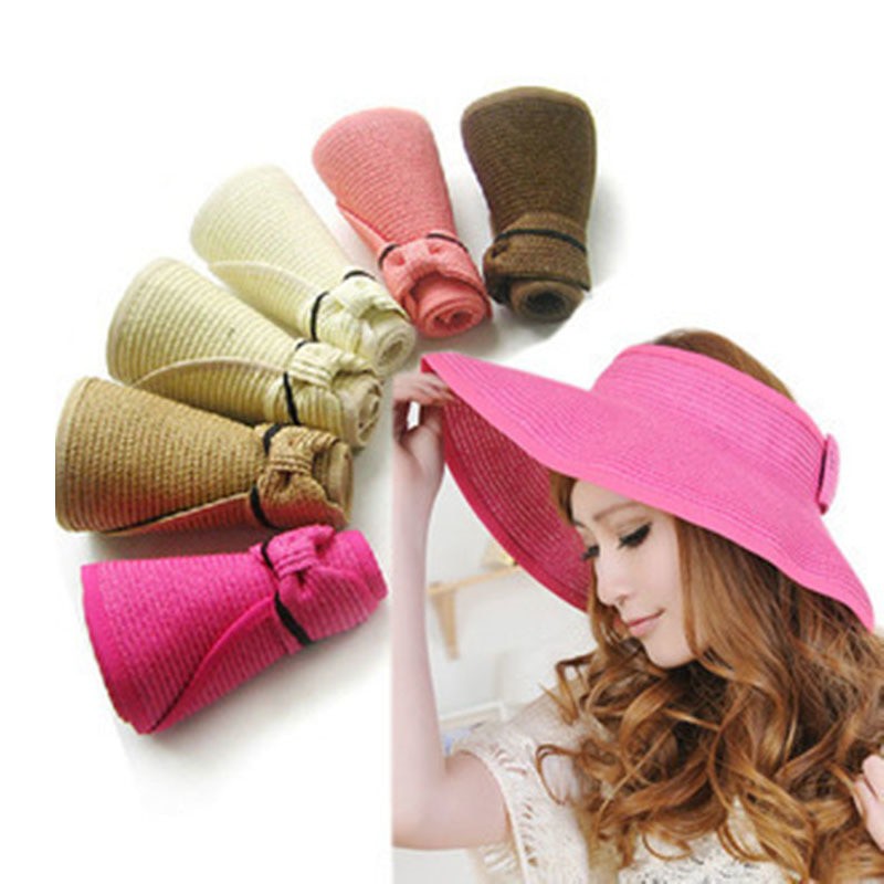 topi pantai anti uv wanita dengan model modis berpita berguna mencegah sinar matahari, nyaman dikenakan dan mudah dibawa kemana-mana karena bisa digulung .