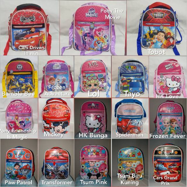 dengan 1 resleting utama yang didalamnya terdapat 1 kantong. dan 1 tempat resleting didepan tas. selain utk anak paud/pg, tas ini cocok juga utk membawa perlengkapan bayi saat pergi jalan2 ke mol.