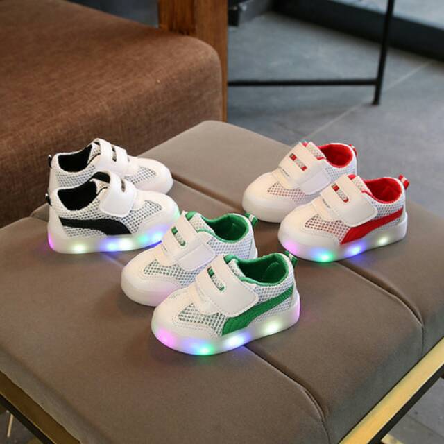 sepatu anak yang dilengkapi led sepatu akan nyala jika diinjak , model yg modern dan lucu juga nyaman untuk si kecil..