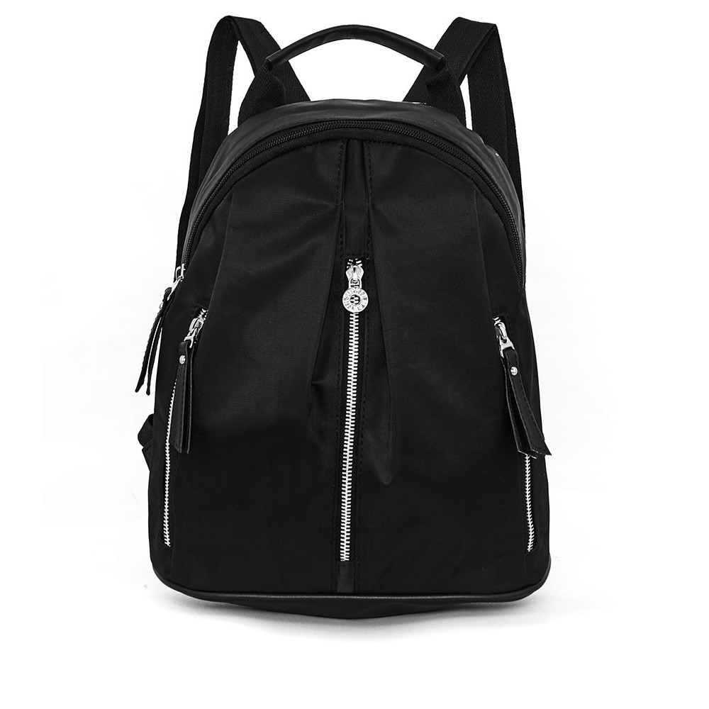 tas punggung dengan bahan kulit sintetis kombinasi nylon berwarna hitam, terdiri dari 1 kantong resleting utama, 1 kantong resleting didalam dan 3 kantong resleting didepan.