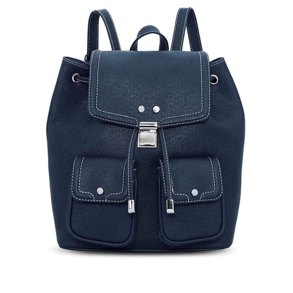 tas punggung berbahan kulit sintetis dengan warna navy, terdiri dari 1 kantong utama dengan tali serut, 1 kantong resleting didalam dan 2 kantong dengan flap didepan.