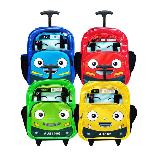 tas sekolah untuk anak sd model trolley karakter tayo the little bus ukuran sekitar 29x14x43cm yang dirancang dengan desain yang keren, lucu dan menarik dengan motif/gambar animasi kesukaan anak. terdiri dari 3 kantong resleting untuk menyimpan peralatan dan aksesoris sekolah, 2 saku bagian samping untuk menyimpan botol minuman atau lainnya, terdapat 2roda sehingga mudah ditarik dan dapat didirikan, ukuran panjang stick trolley 40-62cm. menggunakan bahan berkualitas yang halus, tebal dan kuat. kemasan plastik transparan.