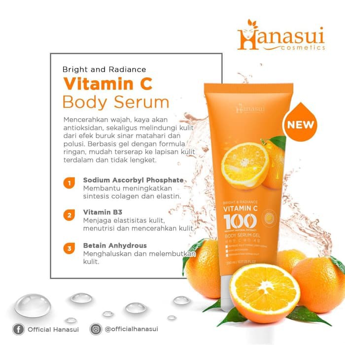 vitamin c (bright dan radiance) : body serum gel dari 100% bahan natural dan ekstrak vitamin c yang mudah terserap dalam kulit dengan manfaat membantu membuat kulit tampak lebih cerah, kaya antioksidan dan melindungi kulit dari efek buruk polusi (anti pollutan), meningkatkan hidrasi kulit.