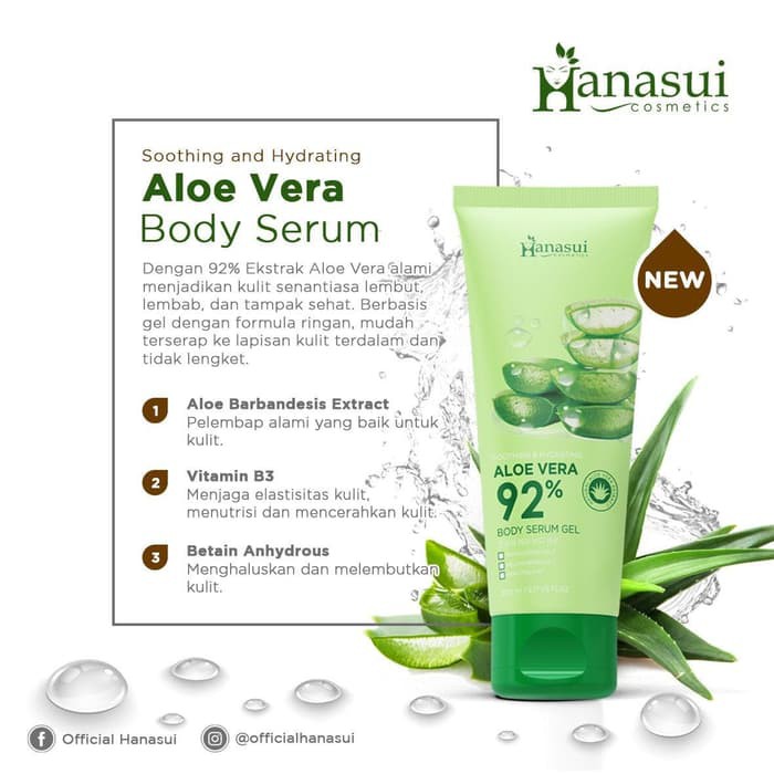 aloe vera 92% (soothing dan hydrating) : body serum gel dari ekstrak aloe vera yang mudah terserap dalam kulit dengan manfaat menyegarkan dan memperbaiki kulit akibat sunburn, melembabkan dan melembutkan kulit tanpa efek lengket, menutrisi, dan membantu meregenerasi kulit.
