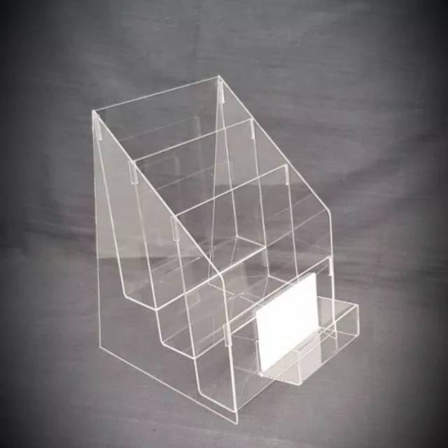 terbuat dari bahan acrylic 2mm bening, untuk brosur ukuran a5 lebar 16cm, tinggin21cm, sudah di lengkapi dengan kotak kartu nama